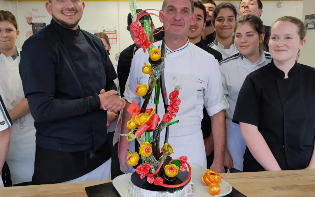 Mardi 24 Mai 2022 Démonstration ce jour de sucre d’art avec Gildas Darcillon et Tony Chuky  Loic Louarn ,classe de terminale Bac pro et Mention dessert à l’assiette, merci à tous  super résultat,super moment de partage..