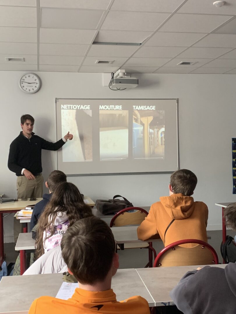 Les élèves de seconde boulangerie-pâtisserie ont eu le plaisir d’accueillir Aubin CRISTINA, meunier et commercial au Moulin de Jugon-les-Lacs. Passionné par son métier, il est venu leur présenter le fonctionnement du moulin ainsi que les différentes étapes de transformation du grain de blé en farine.