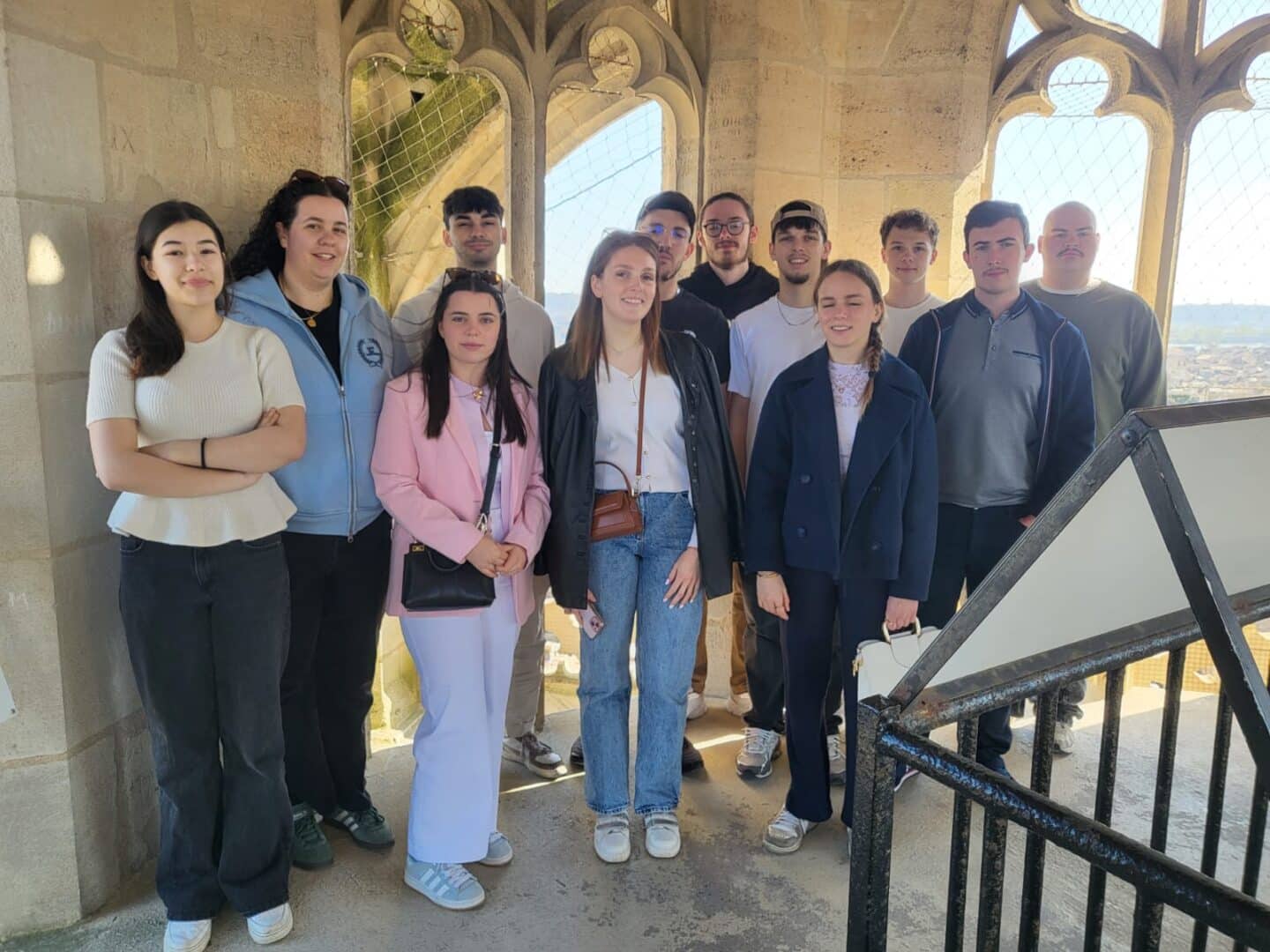 Ascension de la Tour Pey-Berland, le clocher indépendant emblématique de la cathédrale (plus de 230 marches !), offrant un panorama époustouflant sur les toits de Bordeaux, une vue imprenable qui a ravi tout le groupe !