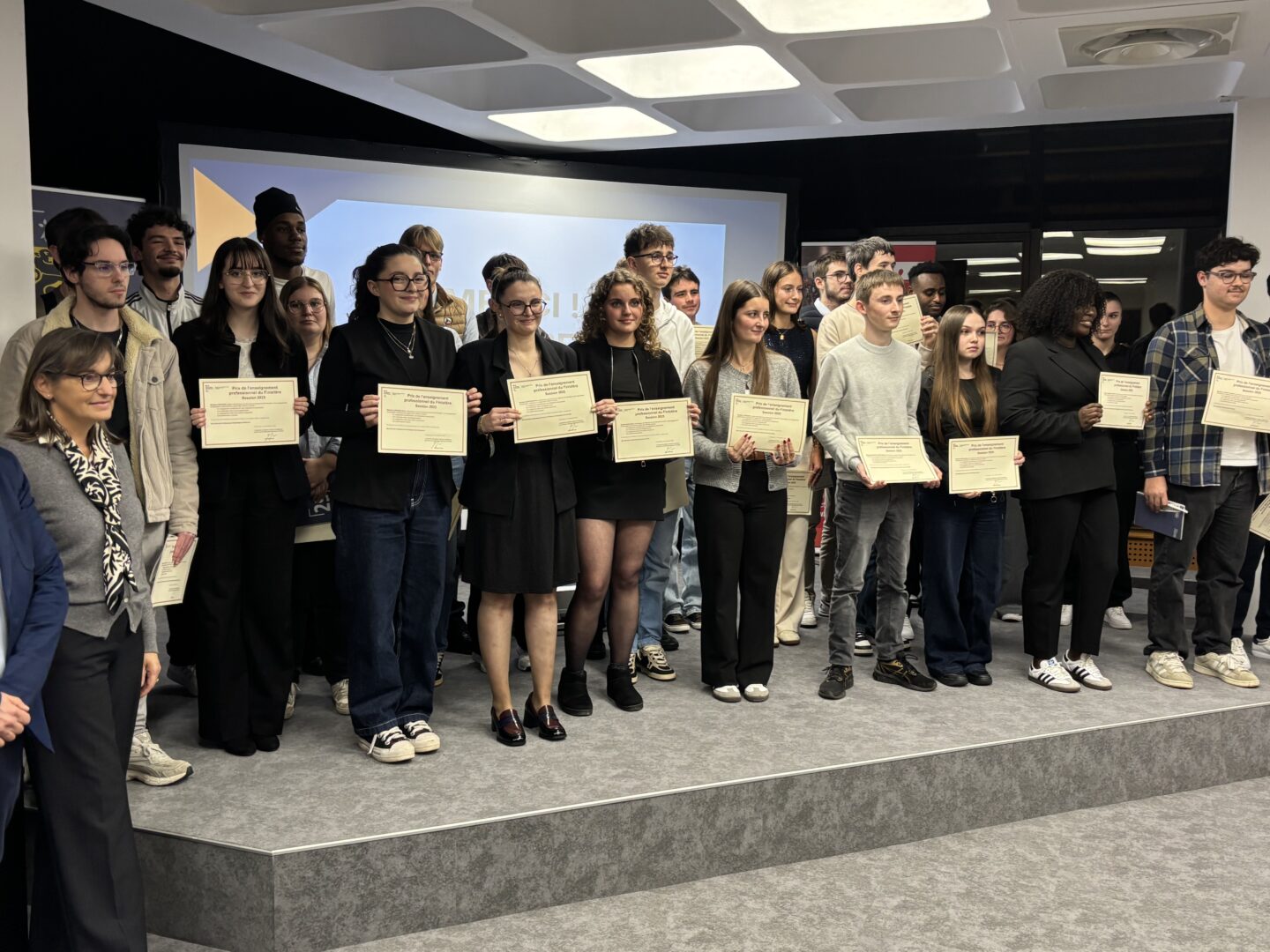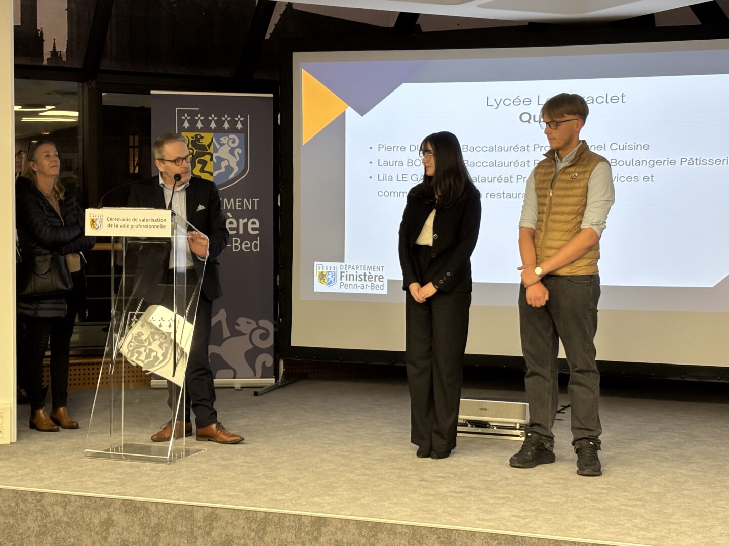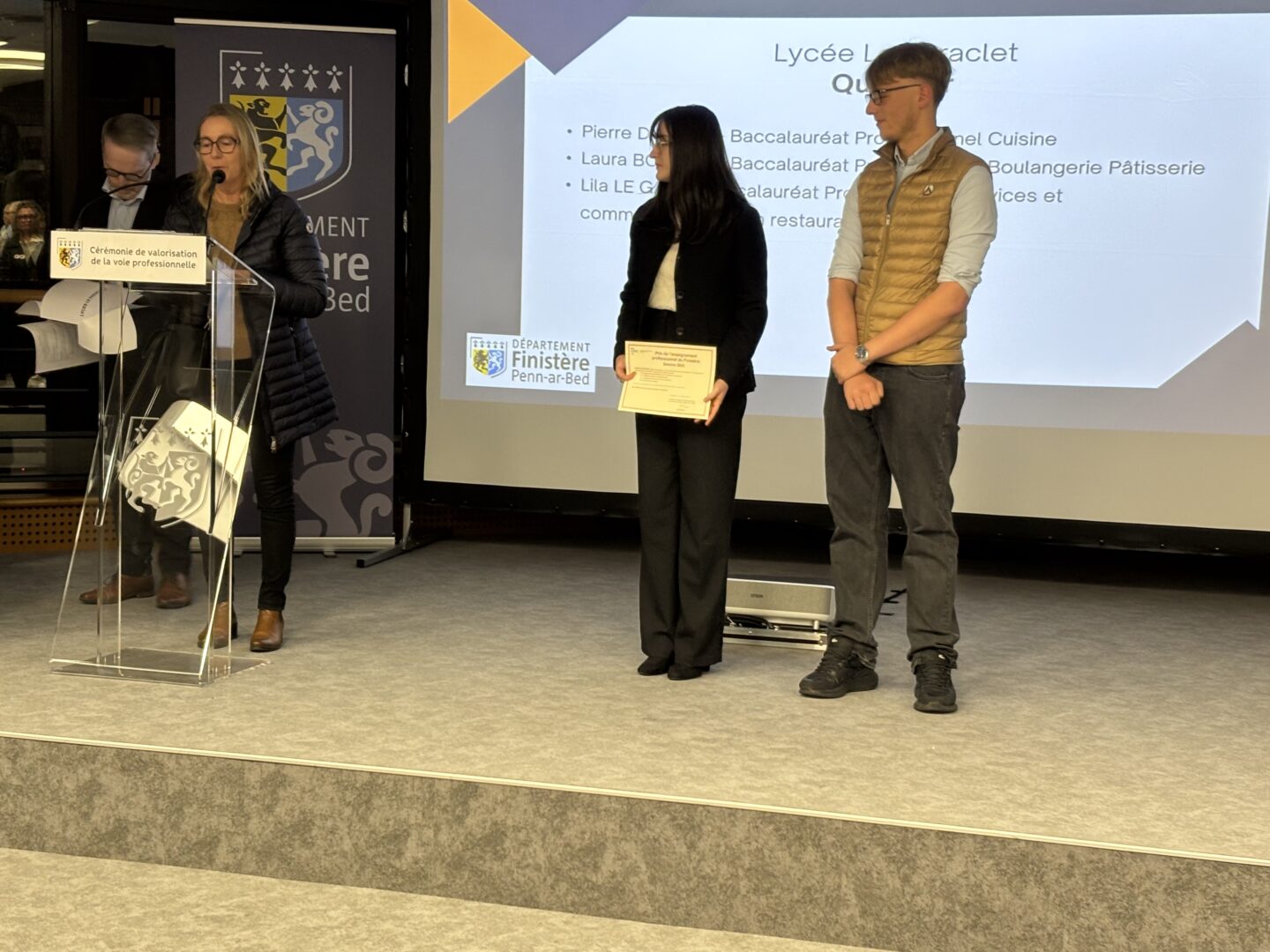 Ce lundi 17 novembre en soirée, la Maison du Département à Quimper accueillait la cérémonie de la valorisation de la voie professionnelle, lancée par l’association Jeunesse et Entreprises (AJE) 29. Une soixantaine de jeunes venus de tout le Finistère, et issus de CAP et Bacs Professionnels, ont été mis à l’honneur et récompensés pour leurs trajectoires qui viennent défier les idées reçues sur les filières professionnelles. Cette cérémonie s’est déroulée sous la présidence de Maël DE CALAN, président du Département.