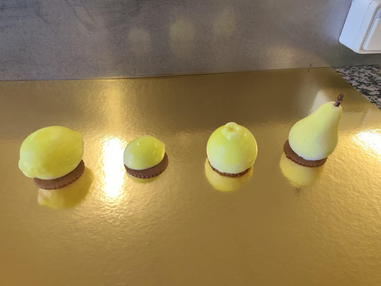 Aujourd’hui, les élèves apprentis en 1ère Bac Pro Boulanger-Pâtissier ont travaillé sur la réalisation de trompe l’œil, un produit très à la mode en ce moment, qui demande précision et régularité : citron et poire en différentes formes… Un joli moment passé au laboratoire.