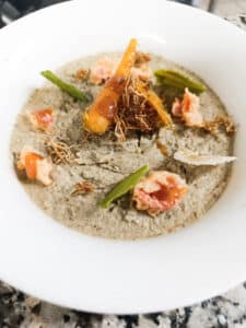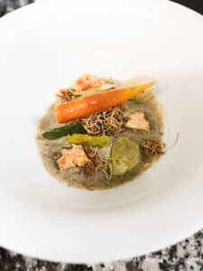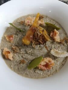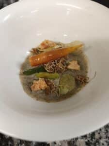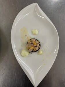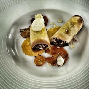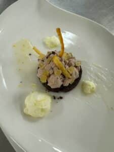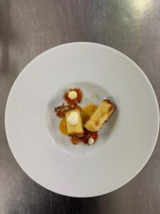 Pain perdu poire, revisité pour le service restaurant d’application du Cornouaille et dessert sur le thème « légumes et crème de champignons chocolat blanc ».