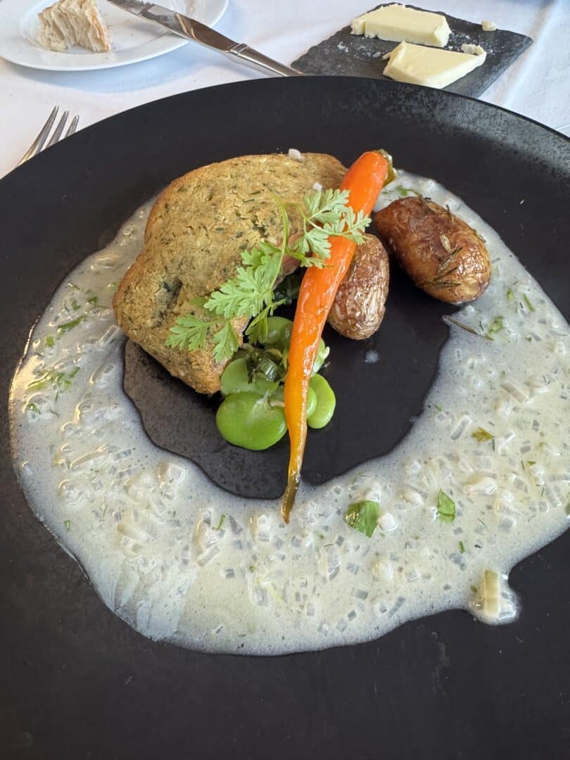 Dos de saumon en croûte, légumes de saison, beurre blanc aux herbes fraîches.