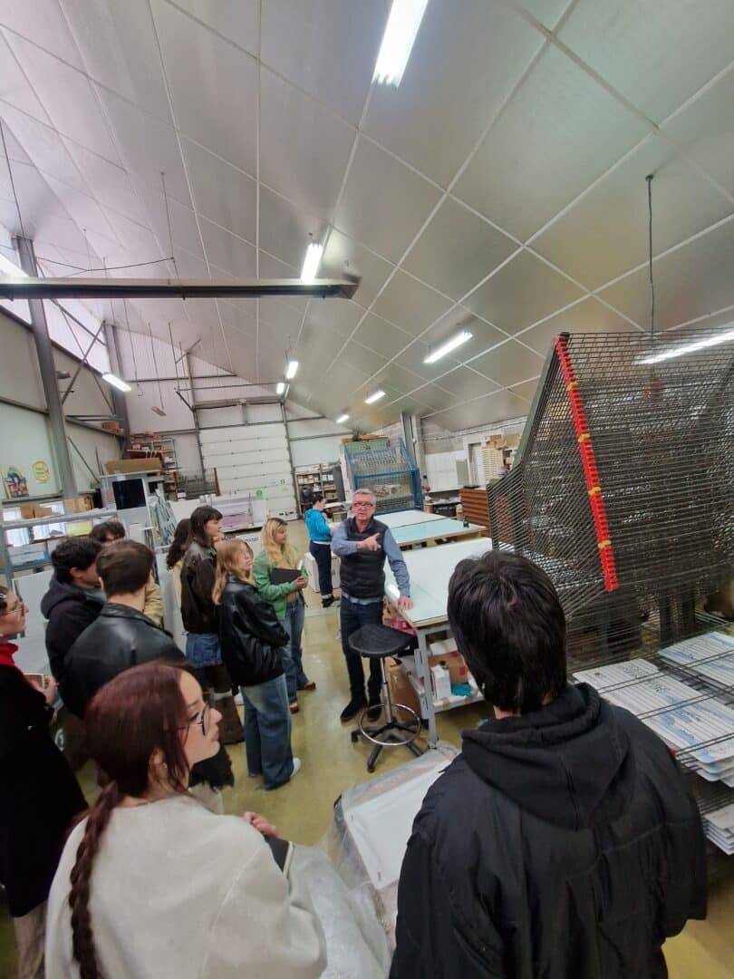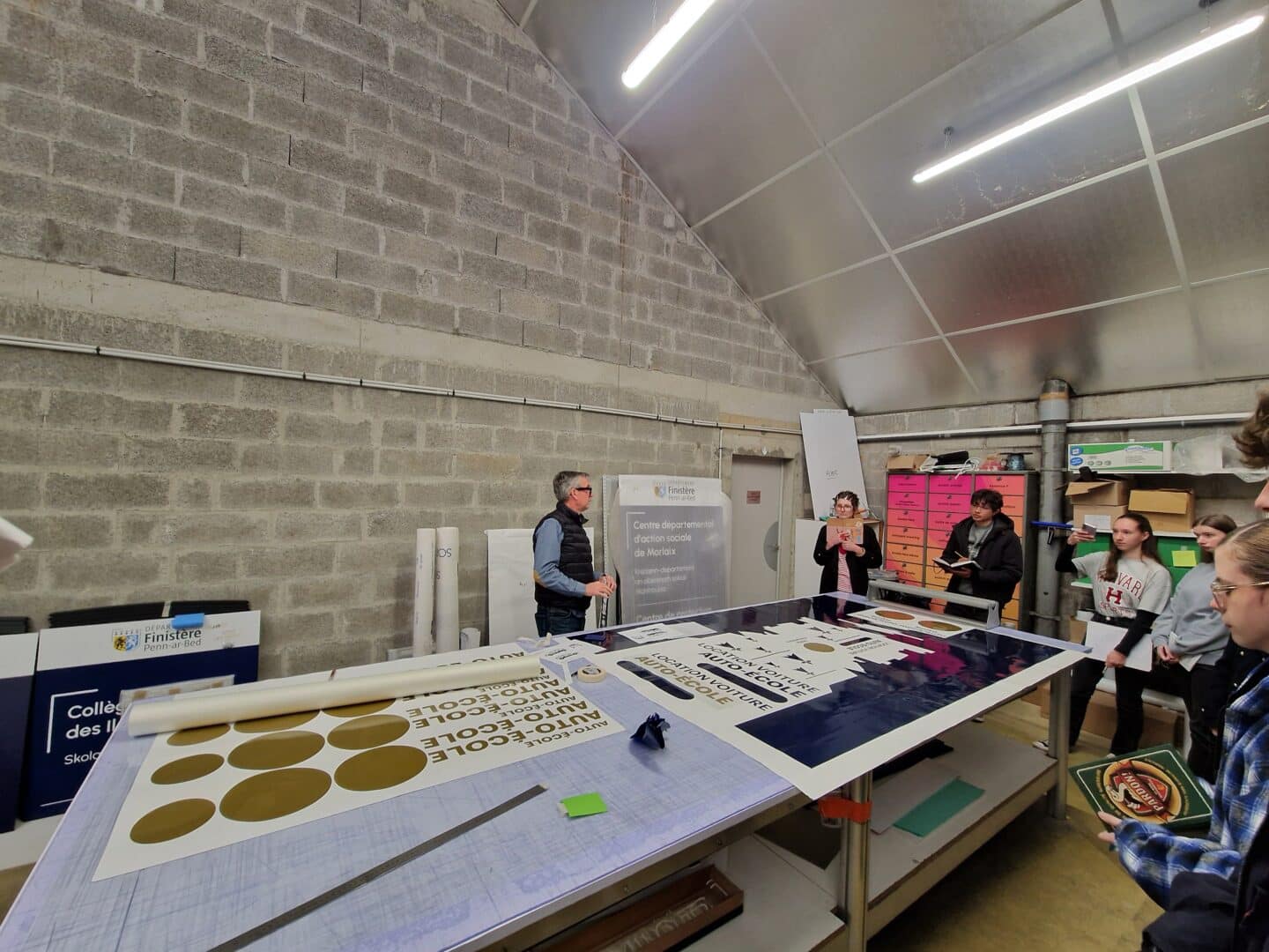 Les étudiants de deuxième année du DNMADe GRAPHISME ont visité l’entreprise de signalétique SIGMA SYSTEMS basée à Ergué-Gabéric. Ils ont été accueillis par Sébastien LE DÉROUT, en charge du pôle de création graphique, qui a pris le temps de leur présenter à la fois la démarche de conception, mais aussi les matériaux utilisés en signalétique. Une visite des ateliers a permis de mieux comprendre les contraintes de mise en œuvre.