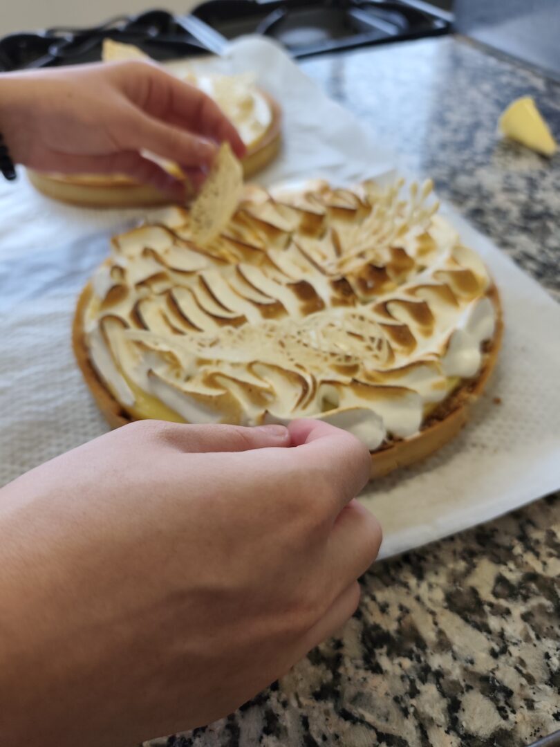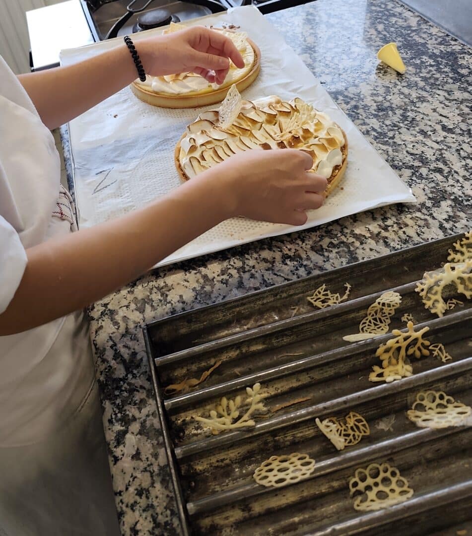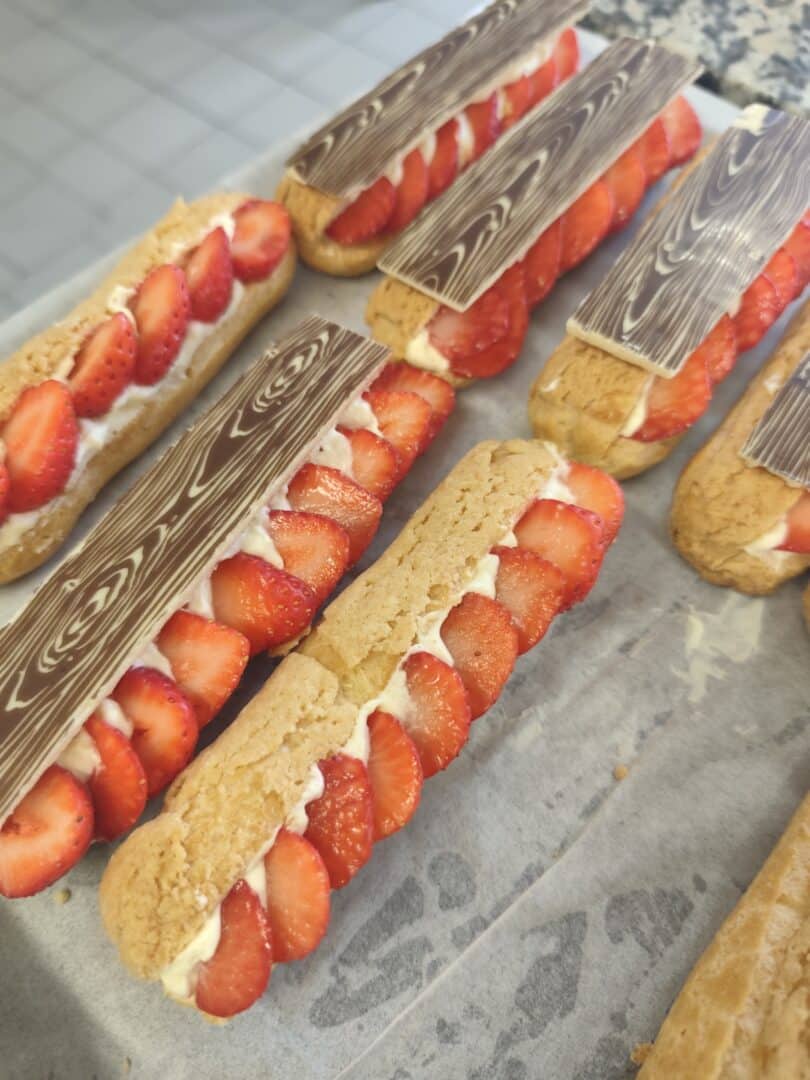 Travail autour de la tarte citron avec création d’un croustillant praliné en insert, création d’éclairs vanille, fraise et chocolat yuzu pour finir avec la réalisation d’éclairs pistache et chocolat noir épicé.