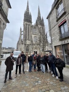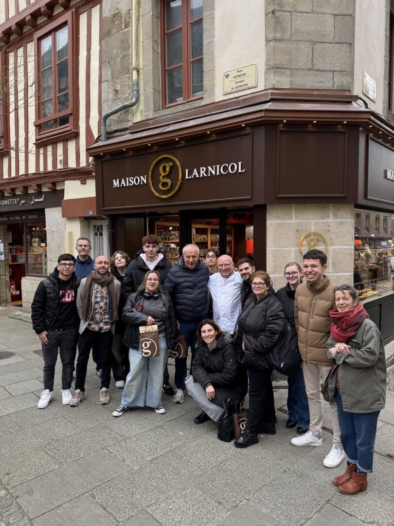 Le Lycée Le Paraclet accueille pour quelques jours 4 élèves Italiens, accompagnés de 4 enseignants, tous venus de Palerme en Sicile pour une compétition culinaire Franco-Italienne organisée dans le cadre d’Erasmus+. La semaine a débuté hier avec une visite de l’établissement et des cuisines où vont se passer le concours. Aujourd’hui, poursuite avec une balade dans le vieux Quimper, l’occasion de découvrir ses ruelles typiques et son patrimoine architectural. Ils ont ensuite eu la chance de rencontrer M. LARNICOL, Meilleur Ouvrier de France, qui leur a présenté son parcours, son exigence du métier et sa passion pour l’artisanat. À la cathédrale Saint-Corentin, ils ont assisté à une démonstration de l’orgue par M. BARRÉ, enseignant de physique et coordinateur Erasmus au Paraclet, un moment impressionnant qui a permis de découvrir la richesse sonore de cet instrument. La matinée s’est terminée à la crêperie autour de spécialités bretonnes. Cet après-midi, ils vont commencer à s’entraîner avant la grande compétition de demain !