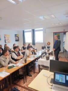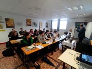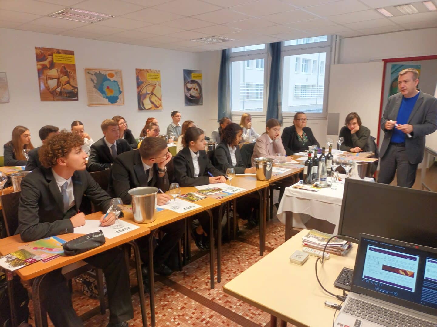 Ce mardi 14.11.2023, 19 élèves de TERMINALE STHR sous la responsabilité de Mme URVOIS Sandrine et 17 étudiants de 1 BTS MHR APPRENTISSAGE et de 2 BTS MHR A sous la responsabilité de Mme LAMAASSAB Christine et Mme LAGADEC Gaëlle, ont participé activement à la conférence des VINS DU MEDOC sous l’égide de M. TAMARELLE Eric, représentant les vins du MEDOC en Bordelais. Ils ont pu découvrir la situation viti-vinicole du MEDOC, l’élaboration des vins, les normes du terroir aquitain ainsi que la qualité des vins en passant par les AOC et grands crus et les crus bourgeois et artisans… Une dégustation interactive de 4 vins AOC sous-régionale HAUT MEDOC, communale et de 2e vin de grand cru…avec grande modération a été proposée ; les participants ont été subjugués par l’aura de l’interlocuteur à la fois restaurateur à Arcachon et œnologue averti et passionné.