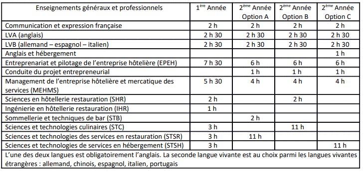Le BTS Management en Hôtellerie Restauration (niveau 5) s’adresse aux étudiants issus du baccalauréat technologique STHR, des baccalauréats professionnels Cuisine ou CSR ou issus de la classe de Mise à niveau Hôtellerie. La formation se déroule sur deux années. La première année est commune et permet d’acquérir les compétences de base dans les trois spécialités que sont la restauration, la production culinaire ou l’hébergement. La deuxième année l’étudiant se spécialise dans l’une des trois options :