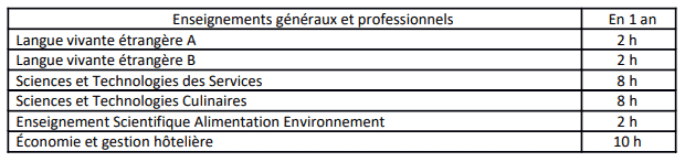 - Compétences économiques et juridiques en lien avec l’hôtellerie restauration : Connaissance de l’entreprise, gestion de devis, droit du travail, droits d’auteur, éthique, sécurité