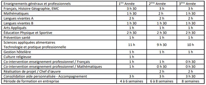 Les travaux pratiques en cuisine pédagogique comme les 22 semaines de stage en entreprise lui permettent par l’expérimentation de s’approprier savoirs et savoir-faire : production culinaire, technique de réalisation et de présentation des mets.