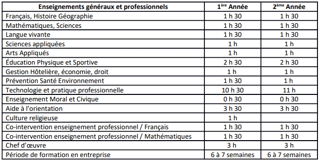 Les compétences acquises au cours des deux années de formation sont théoriques et pratiques. Elles permettent l’insertion professionnelle directe. L’enseignement théorique en technologie culinaire, gestion, hygiène, mathématiques, français et anglais (possibilité de poursuivre une LV2) est prodigué au Lycée. La formation pratique est assurée au lycée en cuisine pédagogique et en entreprise lors d’un stage de 14 semaines.