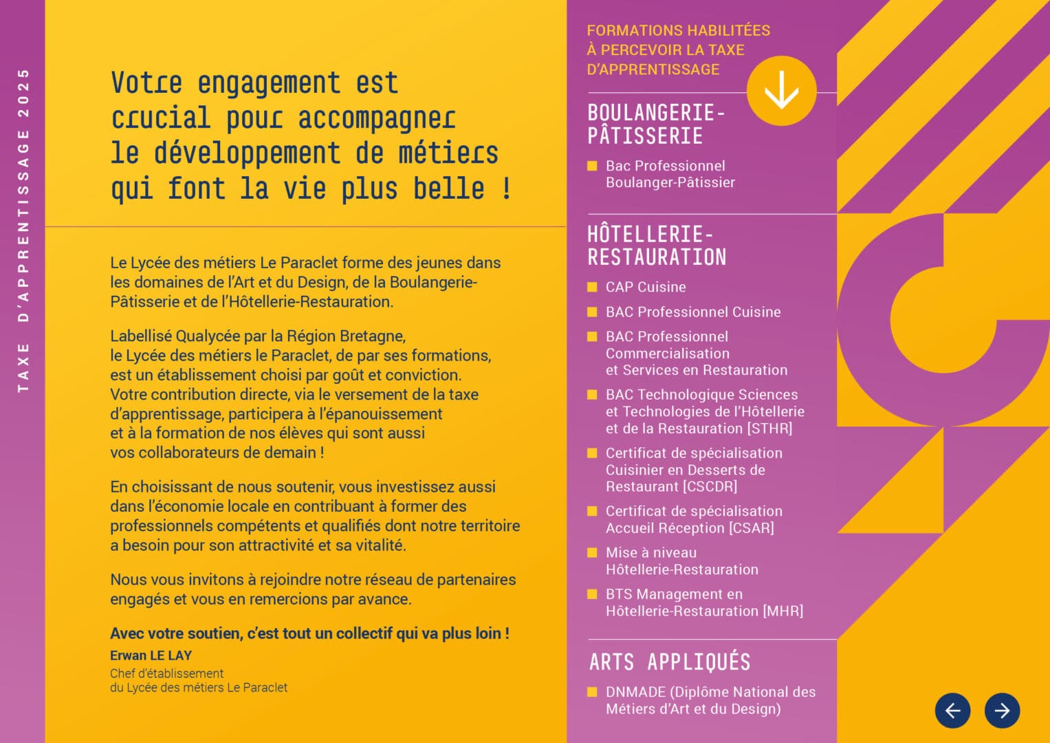 Le Lycée des métiers Le Paraclet forme des jeunes dans les domaines de l’Art et du Design, de la Boulangerie-Pâtisserie et de l’Hôtellerie-Restauration.